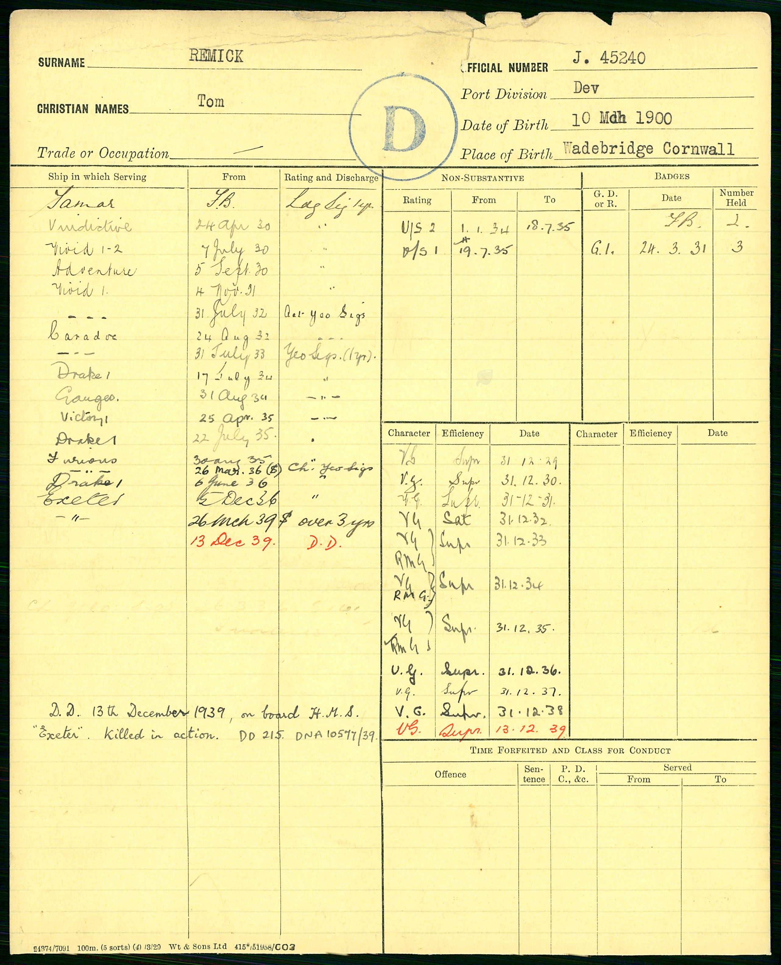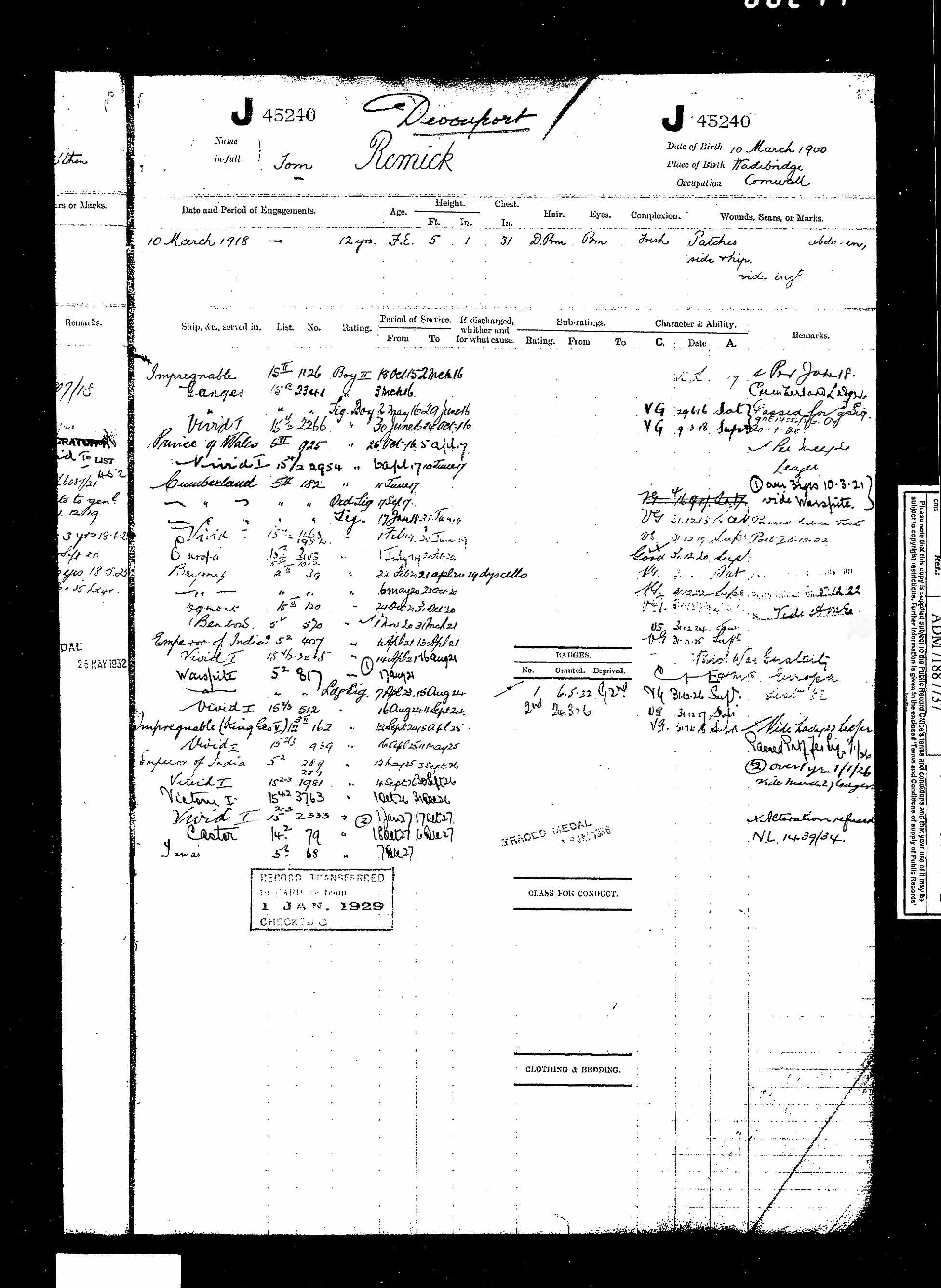 (ADM 363) ADM 363: Continuous Record Cards 1929-1939 UK, Royal Navy Registers of Seamen's Services, 1848-1939 for Tom Remick [image 470 KiB]